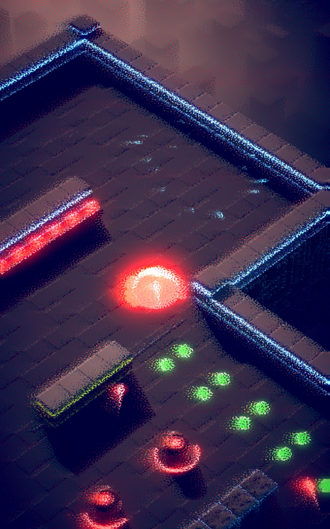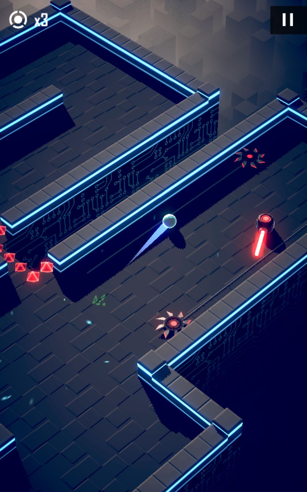 这张上那个带锯齿的为一个陷阱(叫它电锯好了。)碰撞它将会死亡,其拥有墙壁等同的不可穿越性质。电锯移动沿着地面上的轨迹线,方向与速度固定。左面红色的多面体与之前的地图边缘基本一致。右边为一个旋转激光炮台•最弱型,只会固定方向和转速,固定长度激光,找好角度从后面撞上去就行了。