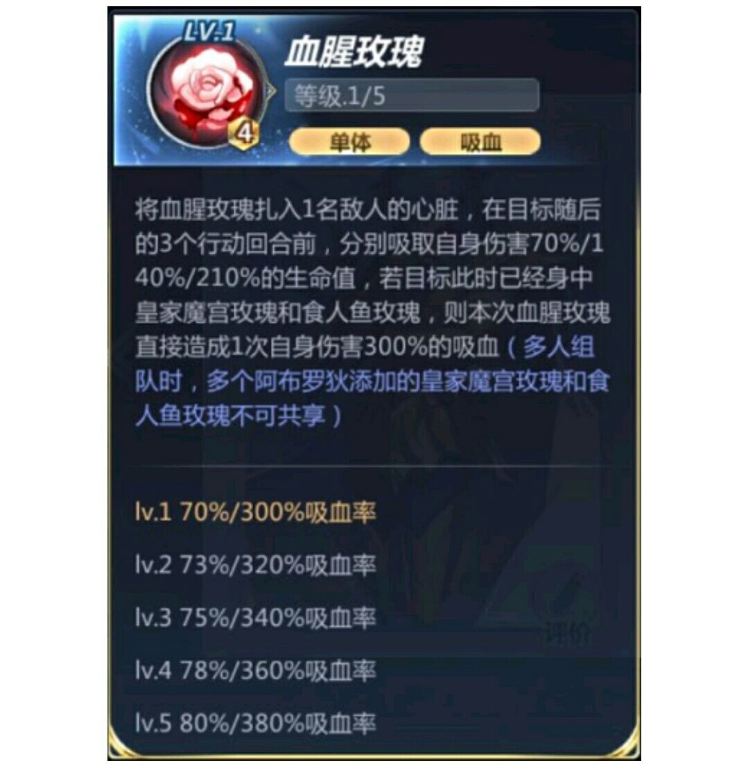 将血腥玫瑰扎入一名敌人的心脏,在目标随后的三个行动回合前,分别吸取自身伤害70%/140%/210%(73%/146%/219%、75%/150%/225%、78%/156%/234%、80%/160%/240%)的生命值,若目标此时已经身中皇家魔宫玫瑰和食人鱼玫瑰,则本次血腥玫瑰直接造成一次自身伤害300%(320%/340%/360%/380%)的吸血。