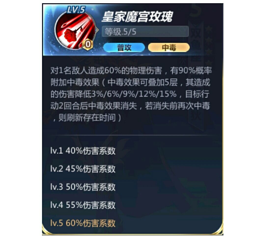 对1名敌人造成40%(45%/50%/55%/60%)的物理伤害。有90%概率附加中毒效果(中毒效果可叠加五层,其造成的伤害降低3%/6%/9%/12%,目标行动2回合后中毒效果消失,若消失前再次中毒,则刷新存在时间)。