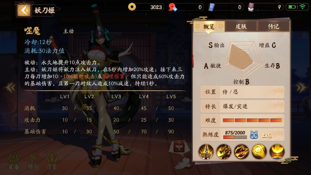 我用的阴阳术是这个。暴击率能在无尽出来之前配合已有的大刀能打出『合理』的伤害。狐火则是为了让妖刀姬的身材更好一点。