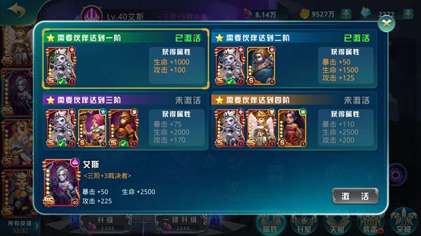 通过自身的其他英雄达到相应的品质、星级,可获得属性加成,每个英雄的羁绊伙伴都不一样,根据玩家培养英雄的爱好去激活。