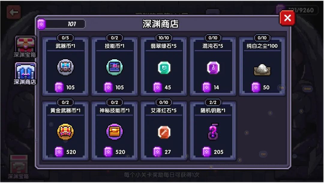 关于各类商店的兑换,请注意,萌新别换黄金武器币!别换!别换!深渊狩猎每日兑换优先翡翠绿石,艾泽红石,刚入坑新玩家可以在前期换部分钥匙,推荐钥匙存量长期在200把以上。