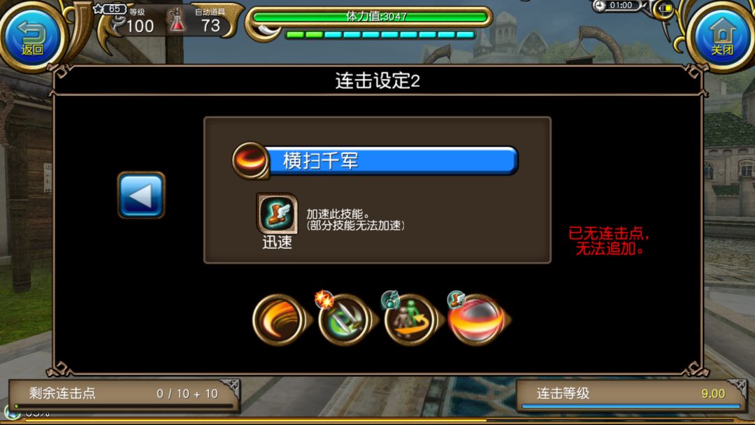 此为1断攻2回蓝3加速4躲技能的综合连击,为核心连击提供加速