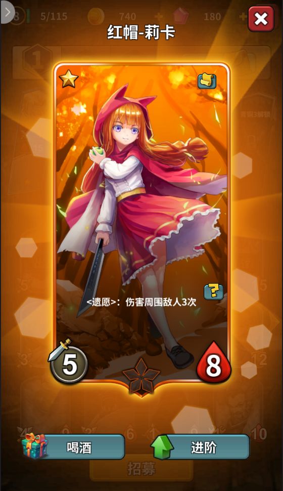 英雄可进阶时会有红点提示。卡牌界面点击下方右侧的进阶按钮即可进入进阶界面。中间可以预览到进阶后该英雄将会获得的新技能效果。进阶需求材料如果齐全的话,点击左下角的进阶按钮即可进阶。英雄进阶后会解锁新的剧情故事。