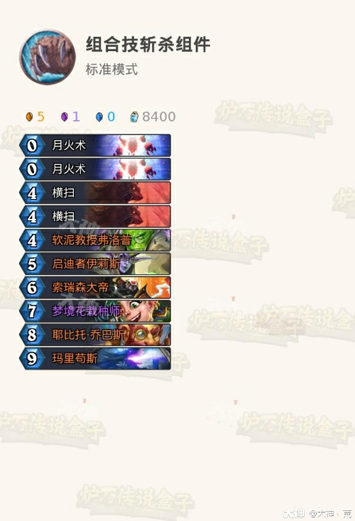 第二种是乔巴斯过到一费大蓝龙,大蓝龙+双横扫+双月火或大蓝龙+教授+横扫+双月火斩杀,哪怕乔巴斯过到的都是非核心牌也不亏。