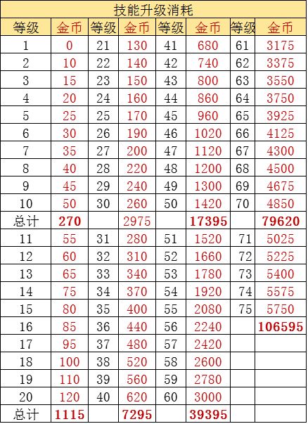 升级消耗表见下,可根据消耗,自己制定计划,升到多少为止,前期不建议刷刷升到满。
