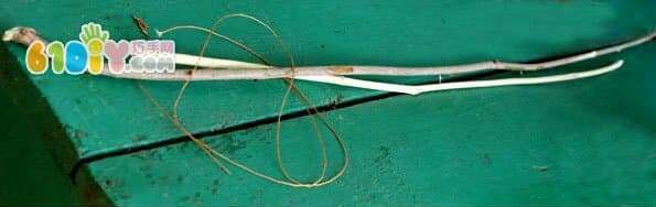 ·用橡筋穿过树枝一端,并打结固定。另一端也同样穿过并固定(尽量以能让树枝有明显弧线弯曲为宜,当然能弯成圆弧的弧度最好)