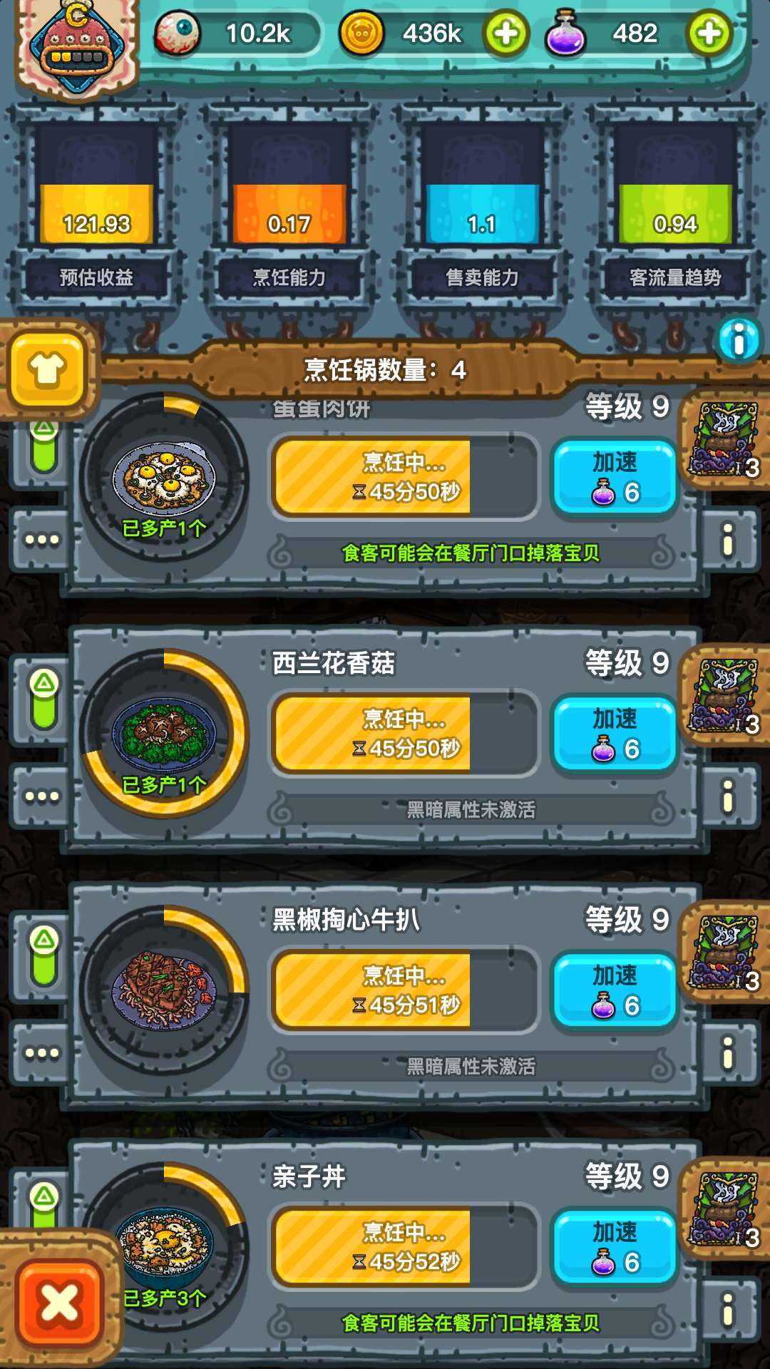 黑暗料理王是一款放置类模拟经营手游,采用黑暗风格的美术画风,在UI设计,场景刻画以及角色塑造上别具一格,各种食材的活物化,也体现出了设计者的脑洞奇大。
