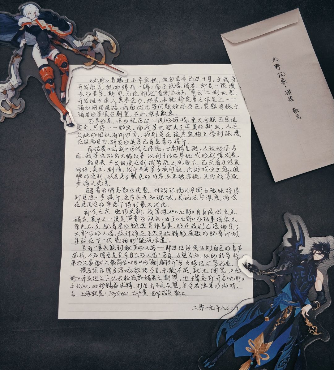 然后,得知这个消息的制作组也很激动,在还不能正式见面的研发过程中,大家的支持是我们莫大的动力。经过讨论,制作人决定以书信的方式向大家传递全体制作组的心意,并慎重地手写下了这份感谢信: