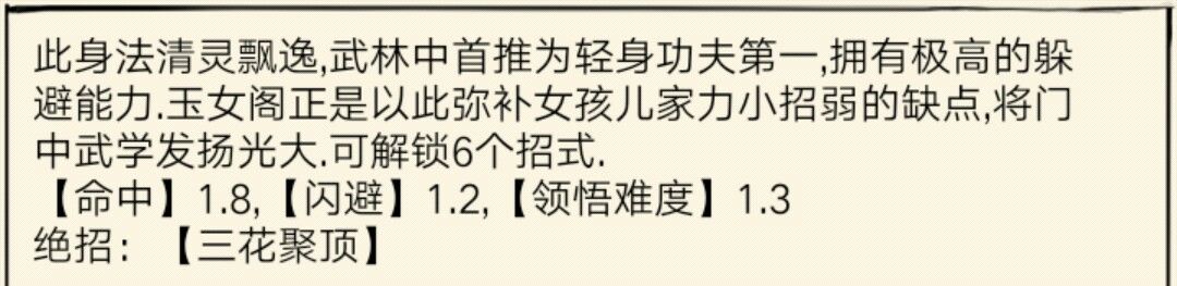 技能介绍:①轻功:轻功是玉女的强项,飞碟舞步仅次于神行,它的神级技能--三花聚顶可以大幅度提升身法三回合。就连深不可测都可以躲的过!
