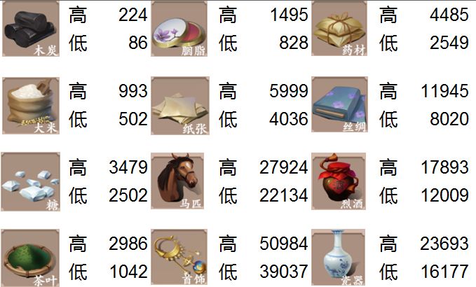 下面进入货物价格分析:(所有价格是采用了4辈子15-70岁所有的货物数据统计而出,不代表获取了全部数据,不过已经比较接近实际情况了)