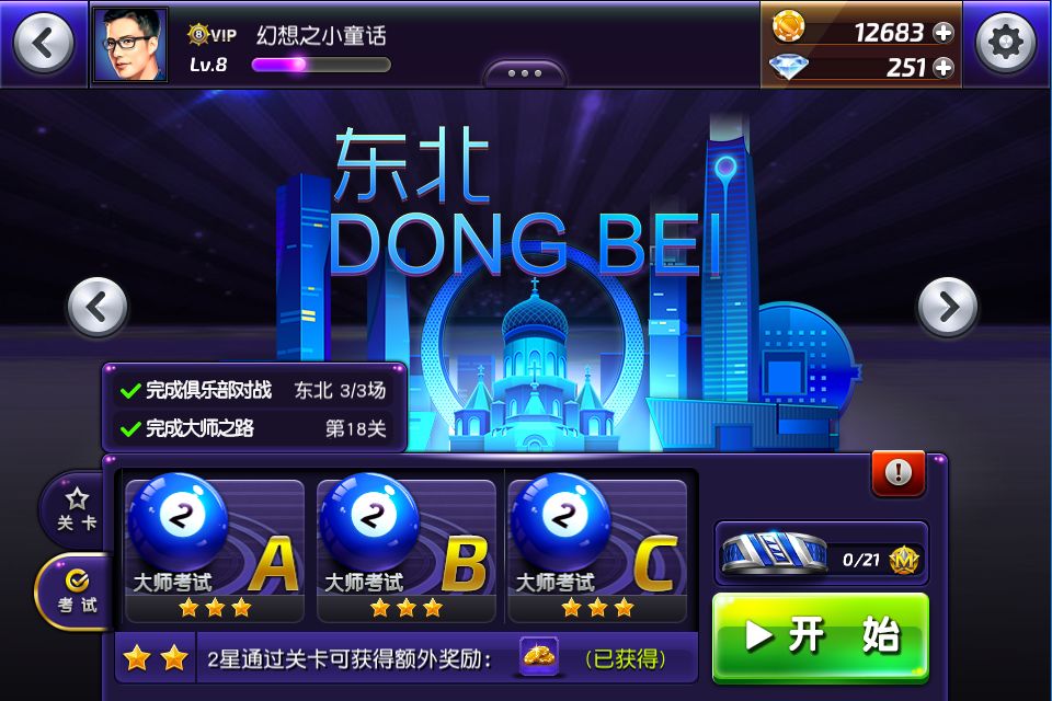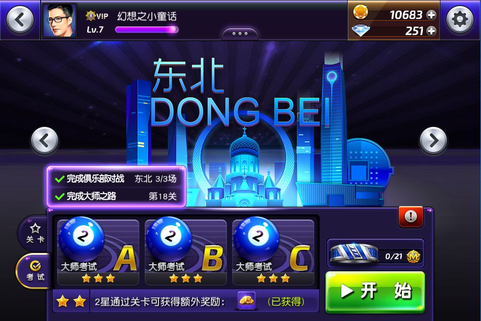 完成3场东北俱乐部对战和18场练习关卡后可以参加三场考试,完成三次大师考试就可以解锁下一城市,就可以进入下一个章节学习新的技能了。