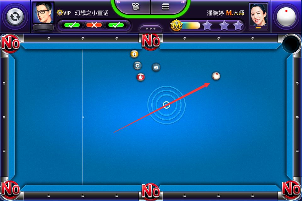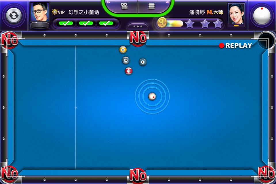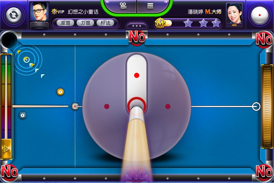 在这一章节里,玩家只能依靠给木球加塞和力度的调整,将球击入袋中。