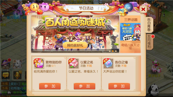 【告白之墙,默契考验】作为年轻化的节日,5·20情人节当然也少不了默契考验和心意告白。活动期间,玩家可组队参与默契度考验,以获取丰厚的奖励和告白石。需要注意的是,默契度越高,奖励越丰厚,且只有首次默契得分≥80分才能够获得告白石哦!使用告白石后,玩家可以在告白墙上大声宣誓,对自己的青春或者所爱的人发起告白,并获得来自三界的祝福,千万不要错过这一浪漫时刻哦!