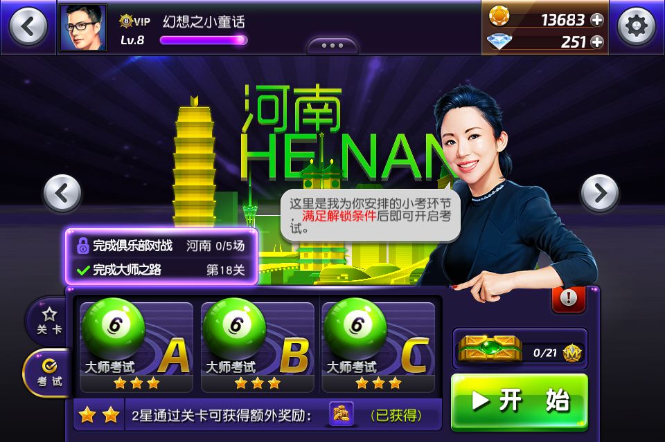 完成5场河南俱乐部对战和18关练习关,可以进行考试,完成三场考试后就能解锁下一场了。