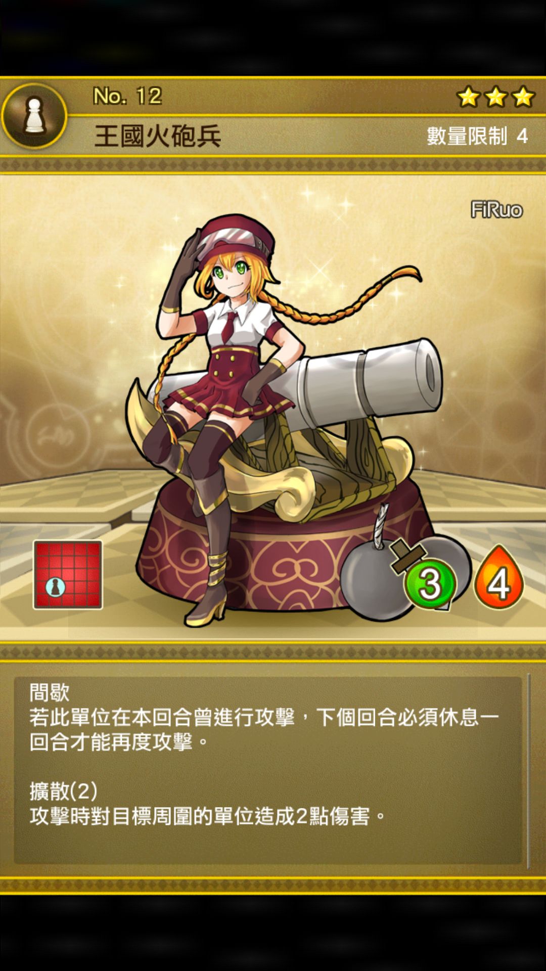 攻击高,范围性无差别伤害的地图炮,是主线第一个二维优秀的棋子,逆风可以迅速清场,顺风则是坑队友的小能手,所以带火炮最好有足够的牺牲或者是有英雄白魔