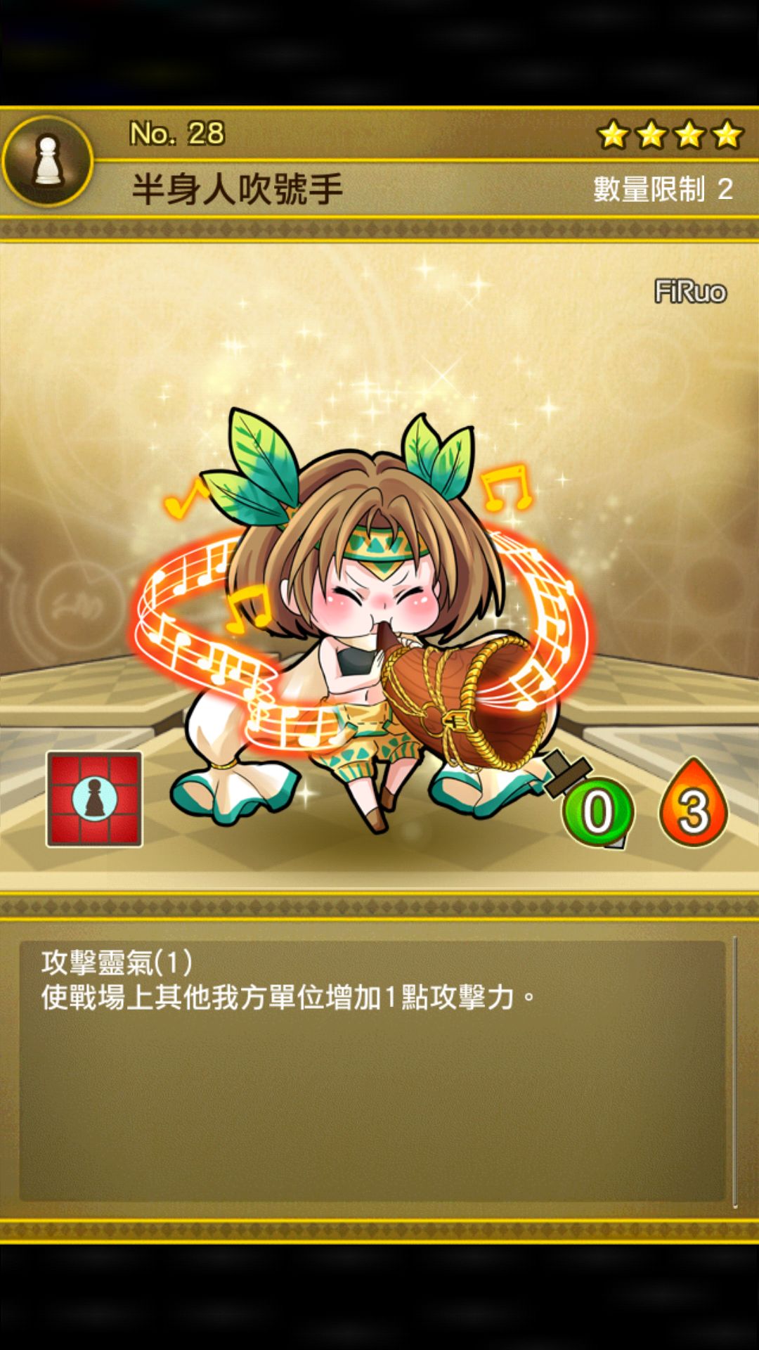 主线第一个四星,每存在一个号角我方攻击+1,顺带一提,士气扣减就是我方场上棋子单位攻击总和,换句话说,号角的异能就是:每存在n个单位,敌方士气额外扣除n-1,配合黑蛇或者野狼,对面士气哗哗哗的扣