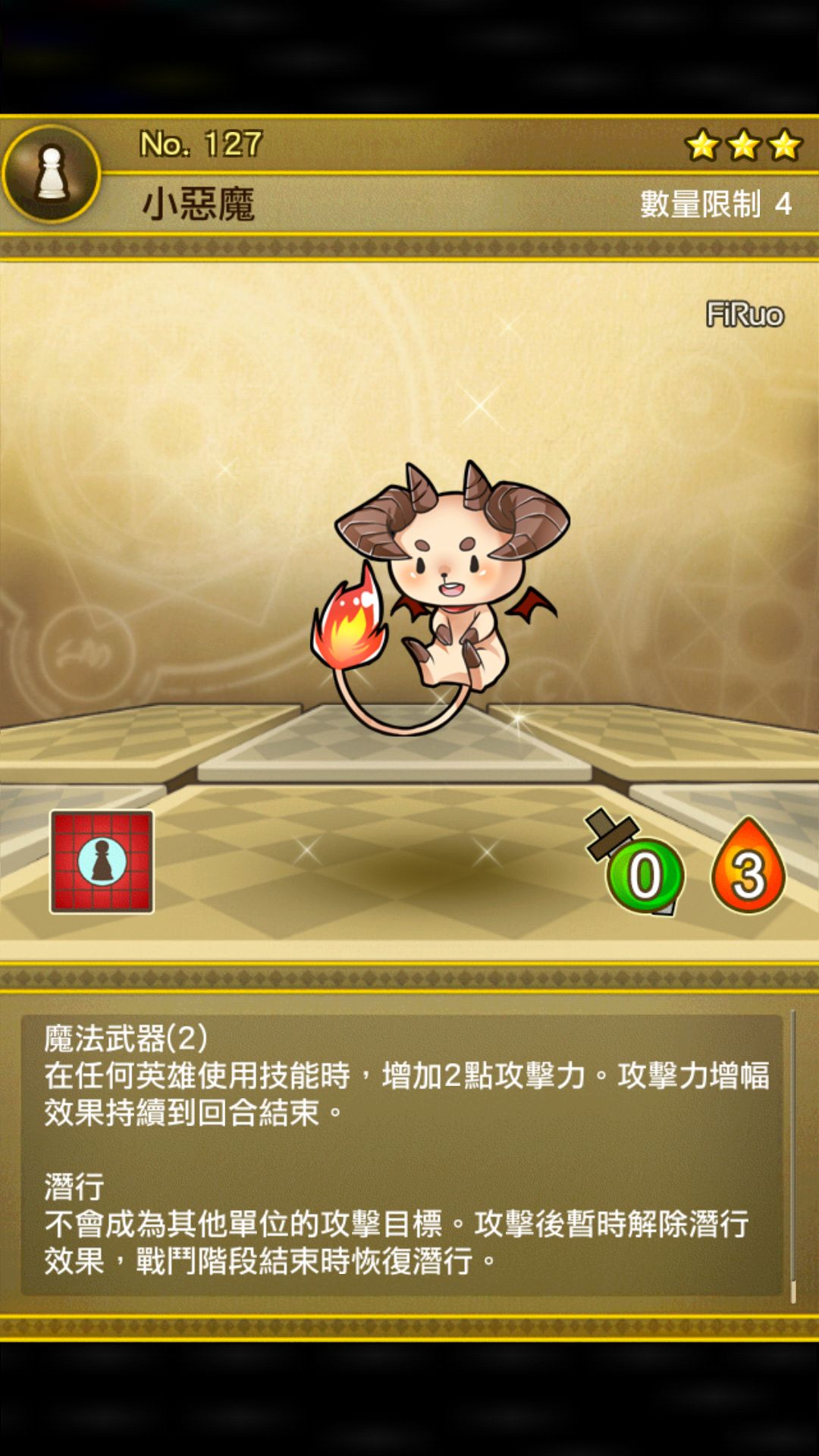 稍微有点用的远程刺客,本身0/3不太适合蹲据点,但可以堵住甜点王子,果农的路 而且输出一回合可以提的很高呢 例如打巨墙,没有足够的棋子可以试一试带小恶魔,放在队长旁边,然后用英雄双祭祀强化