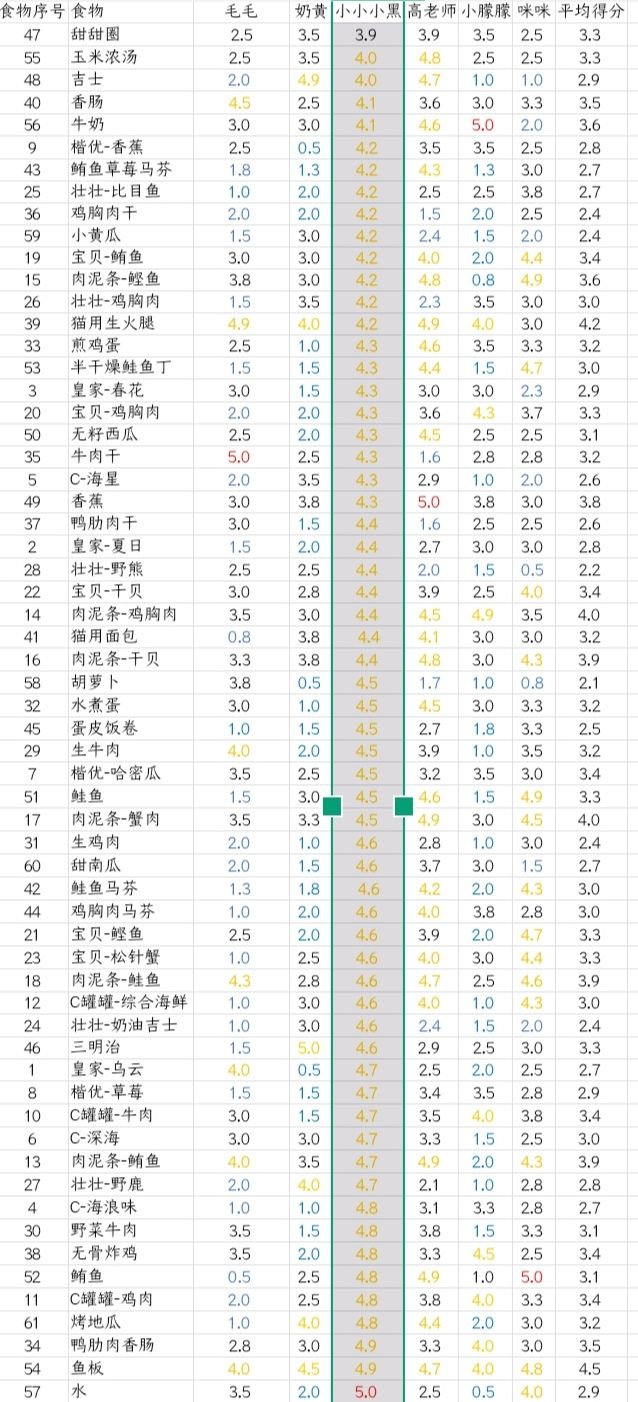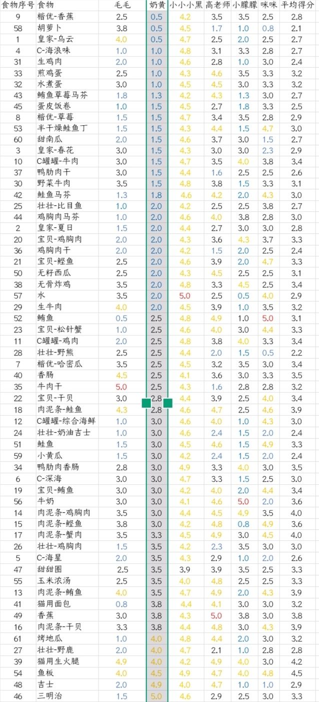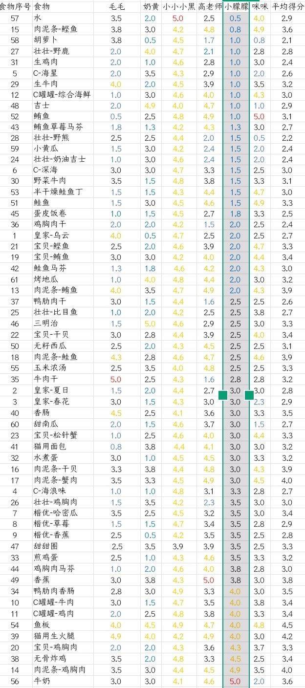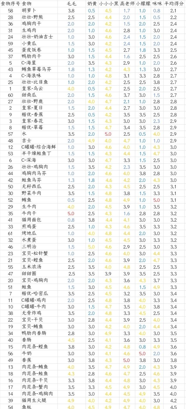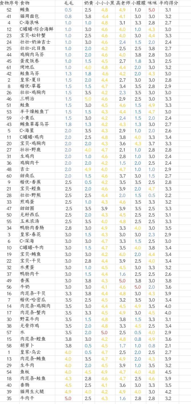第一张是按食物在背包里的排序排的,后面的是每只猫咪的个人(个猫)的食物评分,