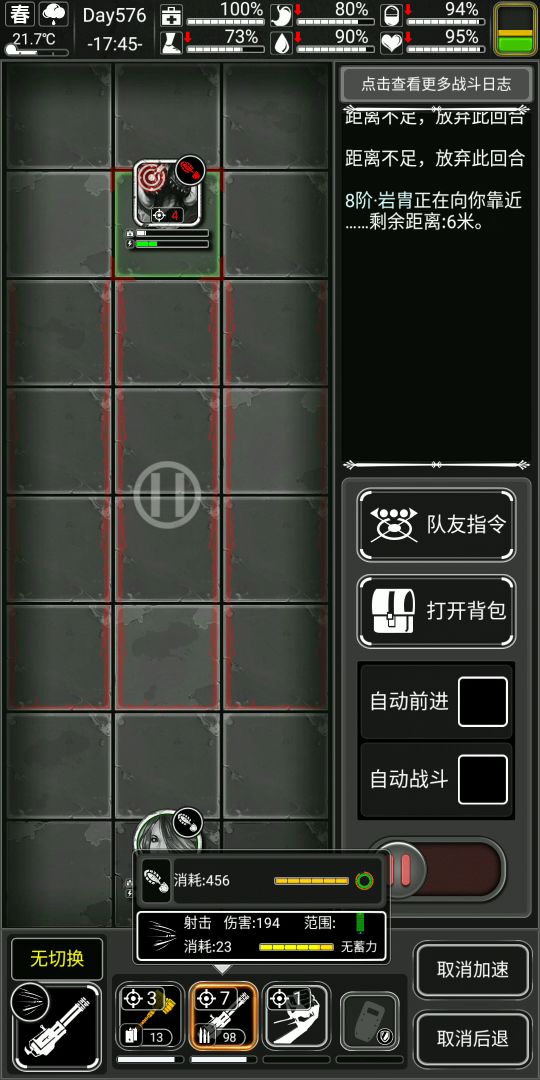 当我选择b武器,攻击范围内无单位或者选择了后退,那么就会消耗80行动力移动(选择后退的后退,点自动前进的前进,其他原地等待)。