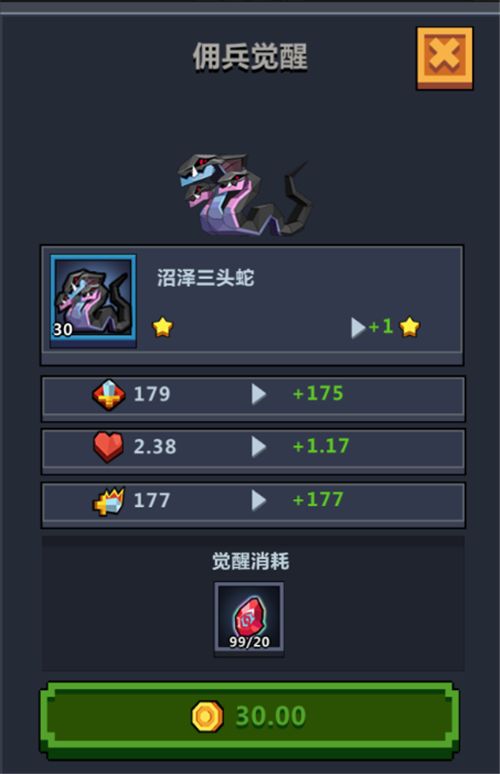 在佣兵升级系统中需消耗相应的金币来提升佣兵战力与属性,佣兵最高等级为30级