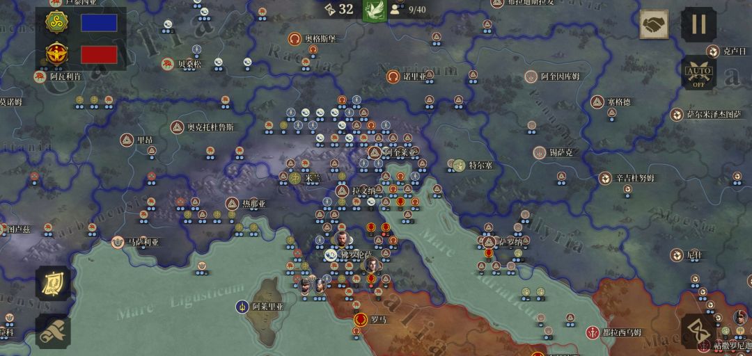 32合局势,此时大象国已参战,就差罗马四城,诶及和克拉苏了因为有一次不小心拒绝了两次斯基泰,拖了点时间,为了帮打托莱多还上了个银将所以,,,