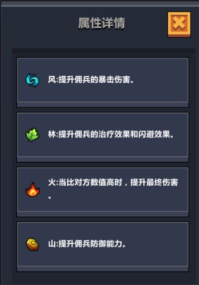 火:当佣兵属性比对方数值高时,提升最终伤害