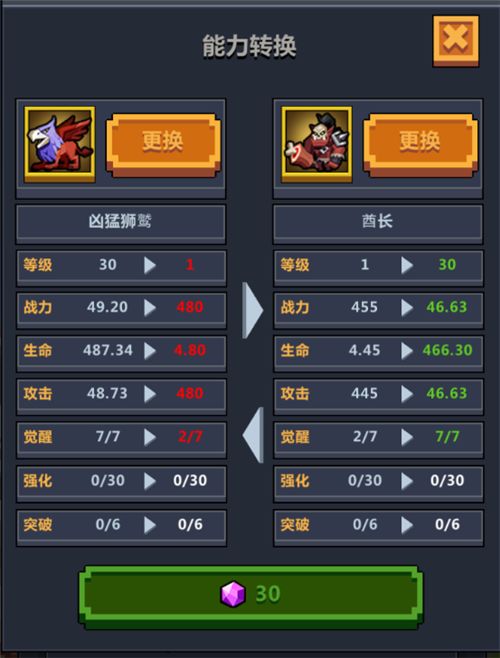 此功能与继承能力相似,能力转换功能可将佣兵等级、觉醒、强化、突破等属性全部转移到其他佣兵身上,但需消耗一定钻石,属性为互换,并不是清空。