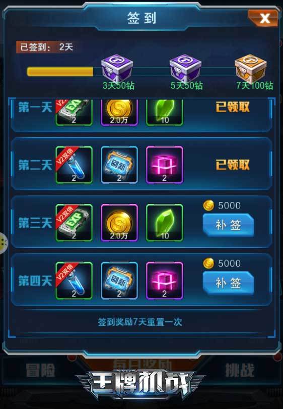 二测期间,《王牌机战》依旧为大家准备了一系列的福利活动。除了每日登陆、签到,提升战力即送钻石以外,在挑战模式的“火力对决”中,在PVP帮当全服排位5000以上的玩家可获得最高1000钻的排位奖励!赶快召集爱打飞机的好兄弟们,一起上游戏当个钻石王者吧!