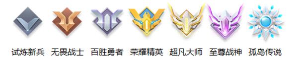 7个段位:试炼新兵、无畏战士、百胜勇者、荣耀精英、超凡大师、至尊战神、孤岛传说