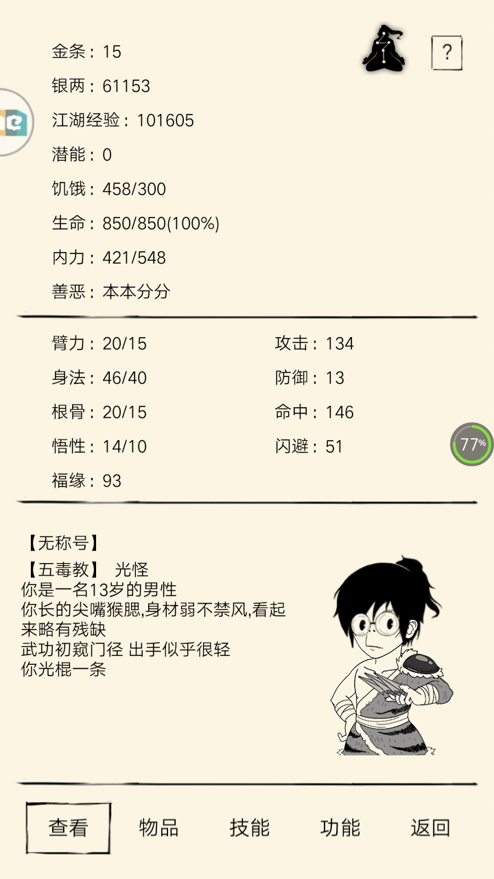 为何这几天挂机打桩,江湖经验就窜到了10 可以参加华山任务了,but我800点的血量,100点的攻击,还走的是五毒的闪避路线,连藏锋山庄的丫头第二次攻击都打不过,更别说打败五毒的魑拿到令牌去华山完任务了,呜呜呜,早晚有一日,我要学遍所有门派功法,你高闪我就高中,你硬钢我就钢你,你骚我比你还骚,你丑我比你还丑,但我肯定比你瘦,还要找一个老婆,不过好难抉择哦,小莲青梅竹马,知根知底,性感荷官会在线发牌,雪山还有个小姑凉想给我介绍对象,哼哼,算了,还是先打击底层NPC拿金条,挂机打桩钓鱼拿经验,吼吼吼,老夫年纪轻轻就要天下无敌了,你们要小心了,不要来找我欺负我,否则我会自挂西郊枝,让你白跑一趟,浪费时间😜