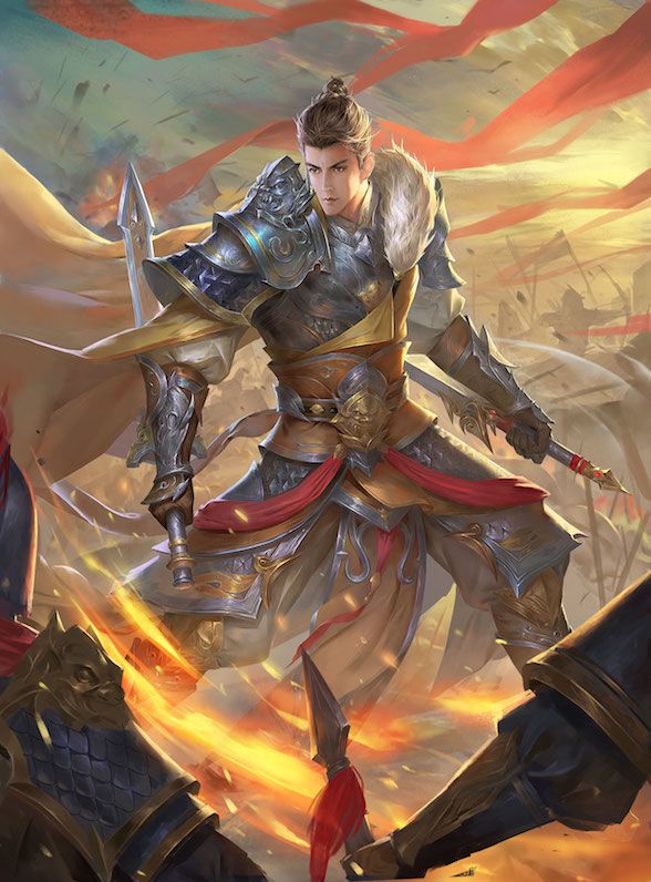 汉室正统的君主,在《墨三国》中是强悍的盾兵,拥有两个主动技和两个被动技,是一个较为综合的英雄。在刘备的立绘中,也选择了用火这种热烈的元素来作为背景,并且绘以龙的形象,暗示着他的真龙之势。