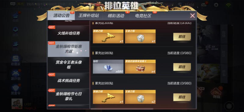 CF手游“金秋嗨枪节”第二重惊喜,诚意回馈!本次回馈福利可谓诚意满满,特别是今日限定的“钜惠充返”,玩家充值指定额度即可额外领取道具福利,包括大量钻石、英雄之钥、王者之骰、英雄武器尊享宝箱等。