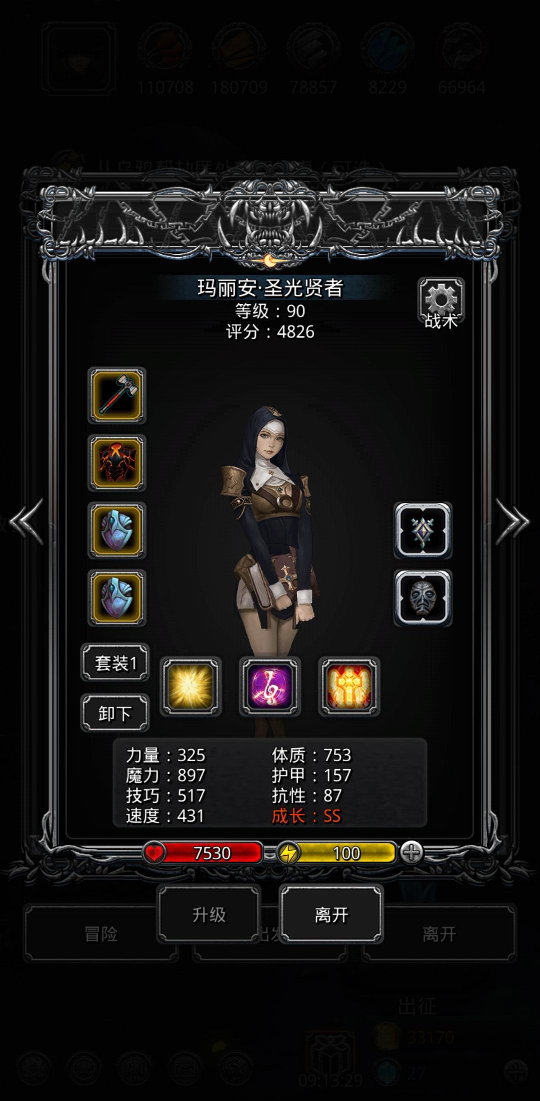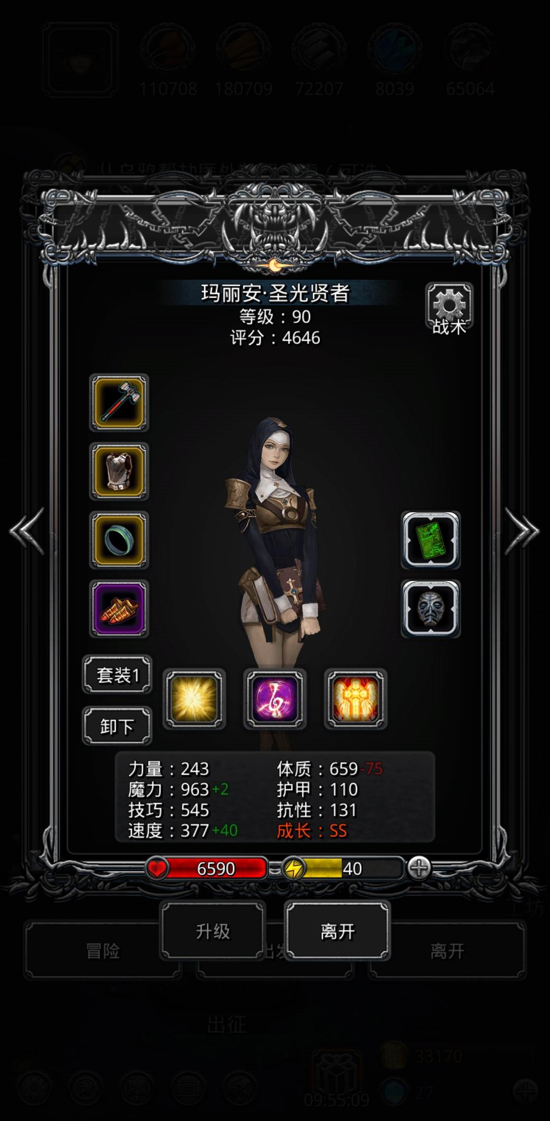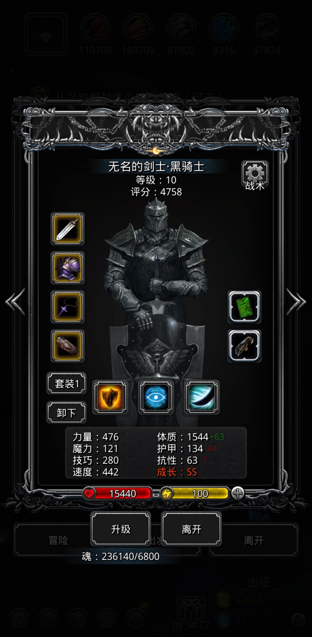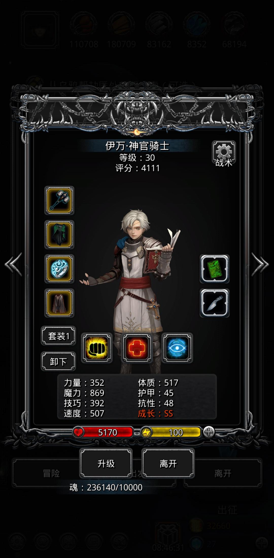 黑骑:守护剑 血龙甲 邪恶挂坠 璀璨护腕 体质战利品 技能:始终嘲讽不攻击 (因为黑骑力速比太高每次都开局没嘲讽就死了其他人 所以带的璀璨护腕加速度 小怪带减速 开攻击容易断嘲讽索性不开) 嘲讽后500+护甲