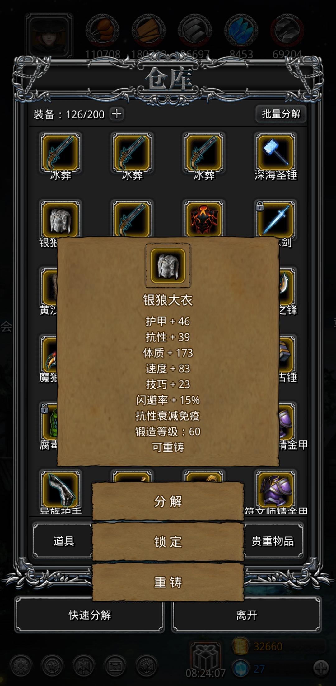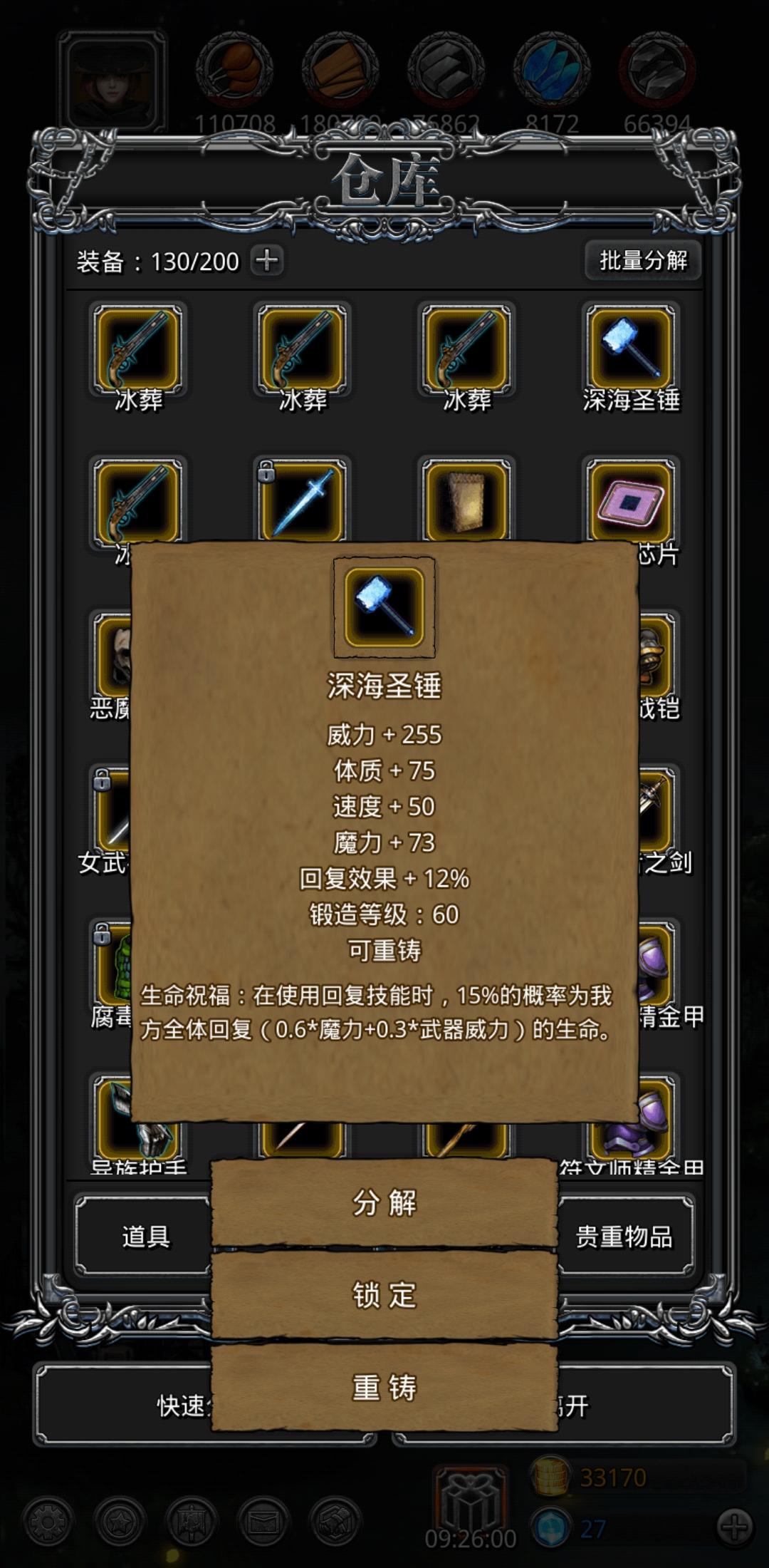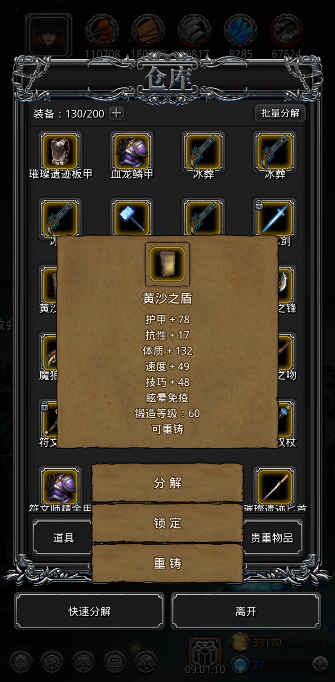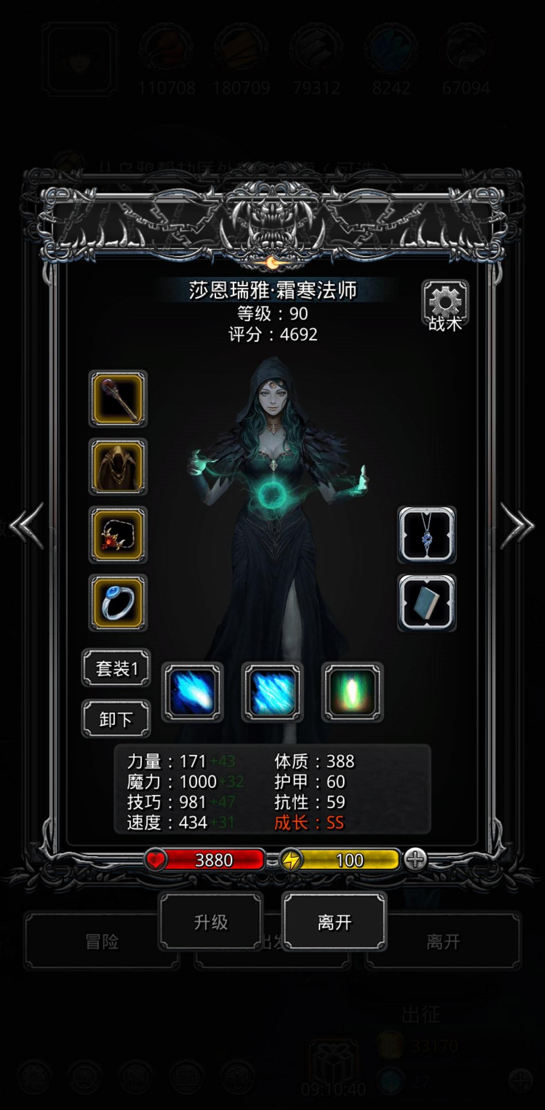 黑骑:守护剑 血龙甲 邪恶挂坠 璀璨护腕 体质战利品 技能:始终嘲讽不攻击 (因为黑骑力速比太高每次都开局没嘲讽就死了其他人 所以带的璀璨护腕加速度 小怪带减速 开攻击容易断嘲讽索性不开) 嘲讽后500+护甲