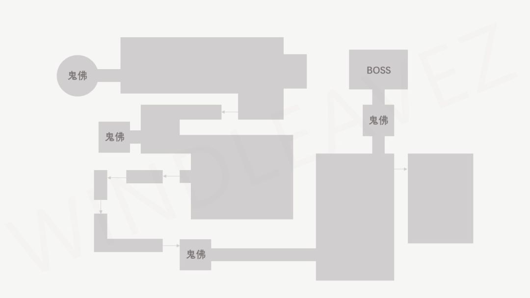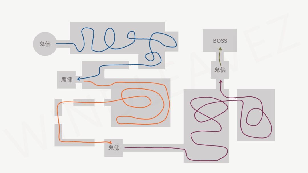 一张典型的《只狼》地图给人类似下图这种感觉,每个鬼佛像后面都是一个相对开阔、立体的战斗空间,便于玩家自由规划暗杀的路线。通过了一块战斗区域之后,紧接着就是下一座鬼佛像。