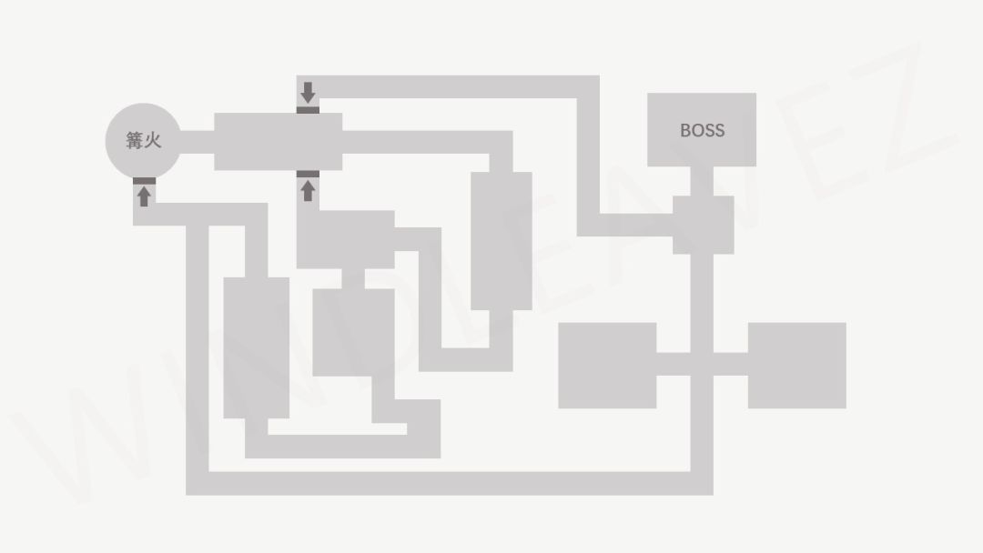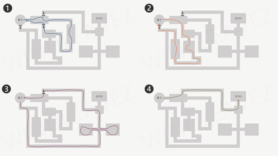 由于游戏整体难度较高,传送点(篝火/灯)又能够提供升级、传送等服务,所以《魂》系列的地图往往是围绕传送点展开的,玩家经常会有绕了一圈又回到初始传送点的体验。在上图中,玩家从同一个传送点出发,每次的路线都不同,一个传送点起到了四个传送点的作用。