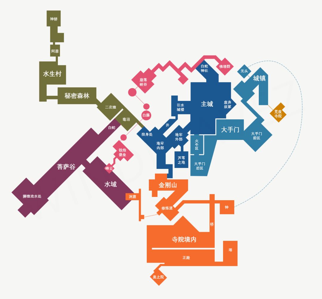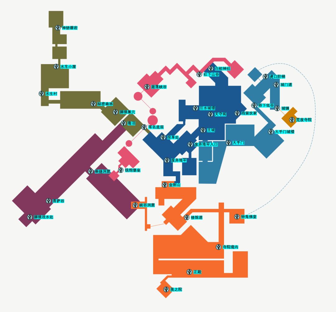 可惜的是,这张地图的作用其实也仅限于粗识大致风貌,对于我们理解《只狼》真实的空间结构没有太大帮助。所有我又整理了一张《只狼》核心区域的地图,限于时间和工具,在比例和细节上肯定有诸多瑕疵,但大致方位和基本结构上应该是较为接近的。