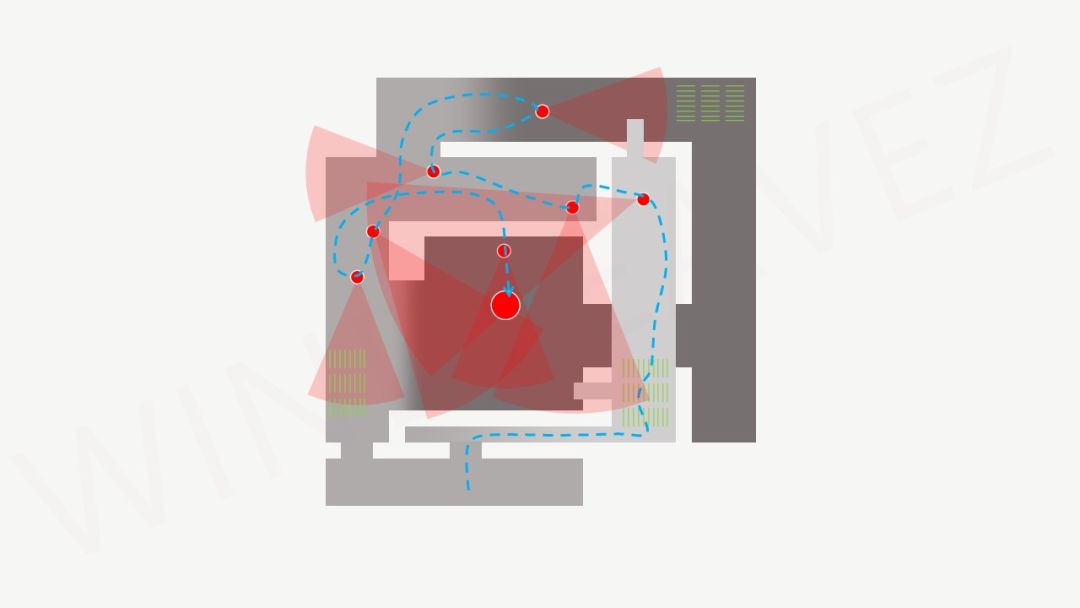 用游戏早期精英敌人武士大将山内典膳的关卡举个例子。其中大圆点代表山内典膳,小圆点代表杂兵,其中包括视野较远的远程兵种、视野更近的近战兵种以及会通风报信的铜锣兵。红色半透明扇形代表敌人的视野范围。地图的深浅代表地形高低,颜色越深位置越低。绿色条纹代表草地。