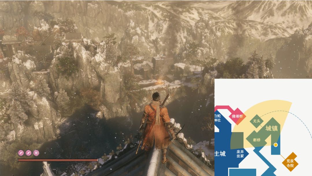 除了上述所说的不同之处以外,《只狼》在小地图的设计上也保留了许多魂系游戏关卡上的设计特点,比如各种曲径通幽的秘道,又比如场景地标和参考物的设置。