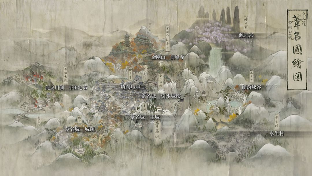 与以往不同的是,FromSoftware 在《只狼》里非常罕见地提供了一张游戏内大地图,让玩家得以在第一时间感受到苇名国的全貌,而不用等“狼学家”们去分析解读。