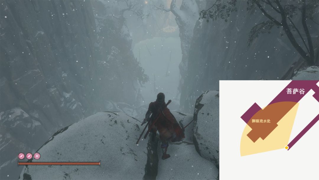 还有在金刚山斩杀白蛇后落下的山崖平台上,可以透过崖壁之间的空隙,直接看到菩萨谷“狮猿” BOSS 战的所在位置。