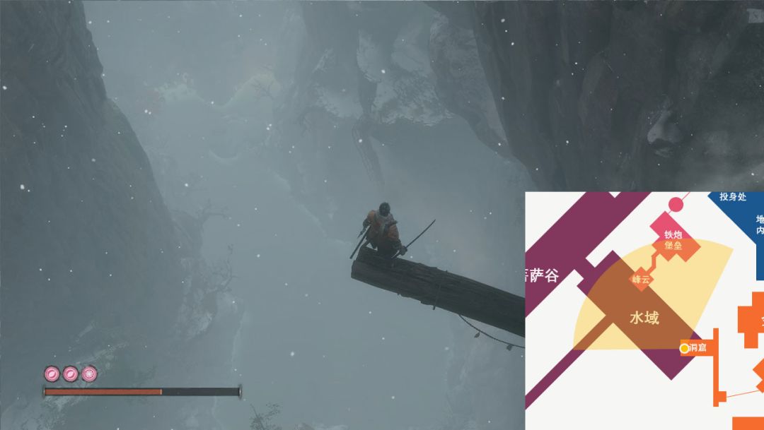 这张图透露出的小地图设计理念,我会在下一部分里阐述。但就大地图层面,我们会发现除了崩落峡谷穿过了苇名底层上方以外,其他地图的位置并没有太多重合。换而言之,在大地图的布局上,《只狼》并没有刻意营造一层叠一层的纵深感,地图之间基本是平铺开来的,只有在地图的交界处(比如投身处→毒池,金刚山洞窟→菩萨谷水域,铁炮堡垒→菩萨谷水域)才能感受到不同地图的海拔落差。实际上,游戏里的高低起伏,更多的体现在每一张地图内部。