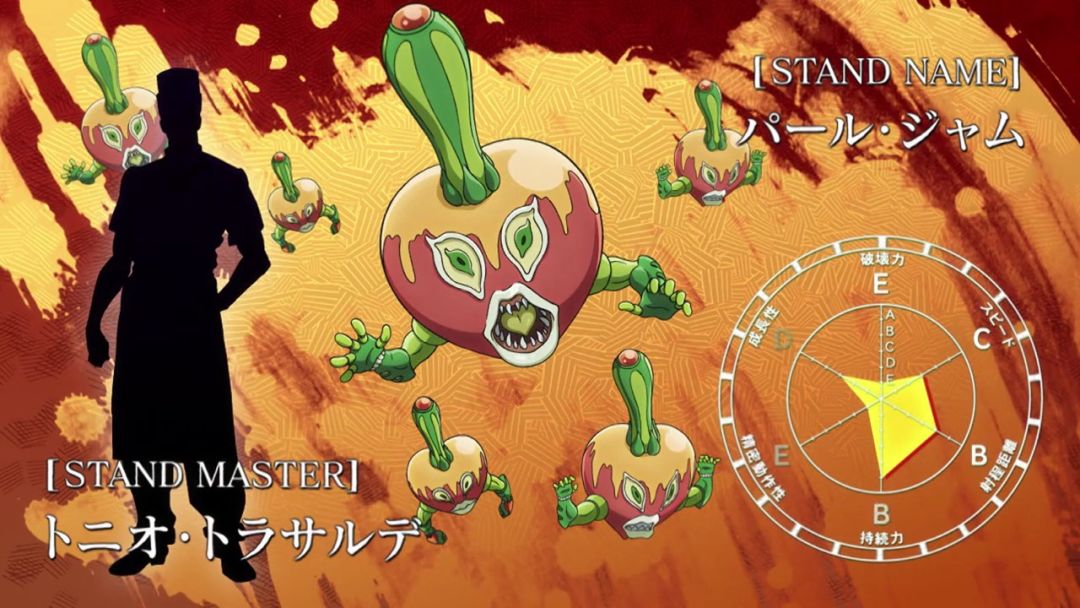 替身:超能平底锅(对,你没看错,就叫这个名字)替身能力:独立型替身,不受替身使者控制,能束缚一人于其底下,若是强行离开铁塔身体会变化成钢铁;攻击铁塔会收到铁塔的反弹