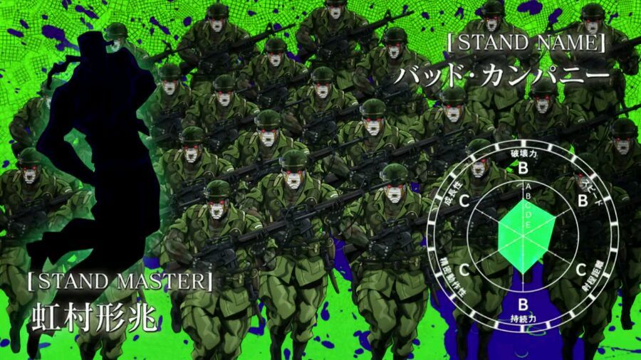 替身能力:一群玩具大小的军队,可使用机枪,坦克,飞机等,可与实际军队匹敌