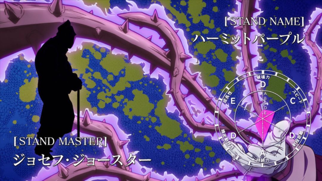 替身使者:乔瑟夫·乔斯达替身:隐者之紫替身能力:可通过相机、电视等物品进行“念照”,可远距离侦查,其次作用可像藤蔓一样伸缩