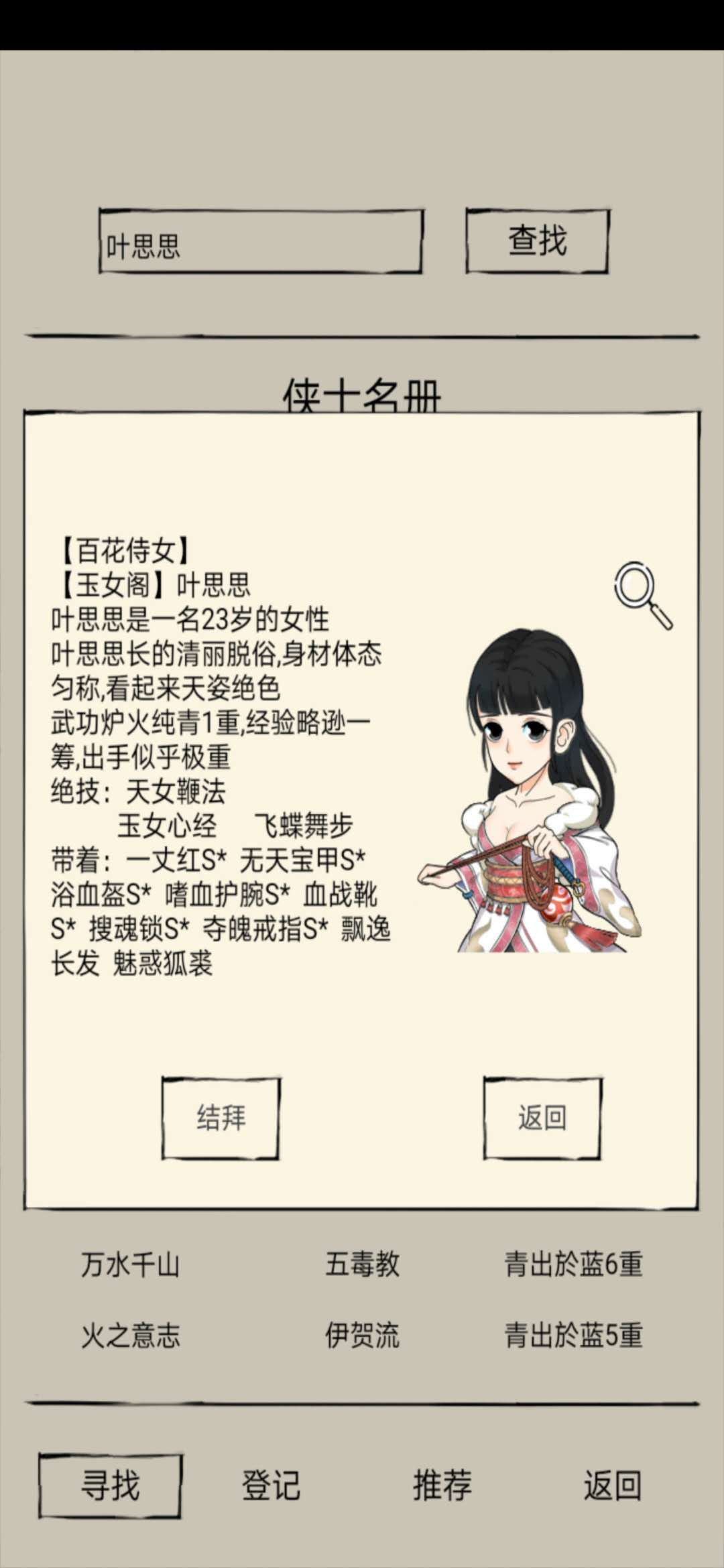 叶思思 女 23岁 江湖人称“叶托”,万花四名月之一。由于其聊天室从不出现,qq群和微信群从不发言,却成为全服第一个穿满7件炉火s装备且洗满身法的隐世高手,故大家推断为官托。其性格孤僻,不与人交流,性格乖张,氪巨款玩单机,故曰【东邪】。无人知晓其发展规划,或许哪天突然人没了,也或许哪天突然就霸服了。叶托的真实身份恐为混六第一大谜团。