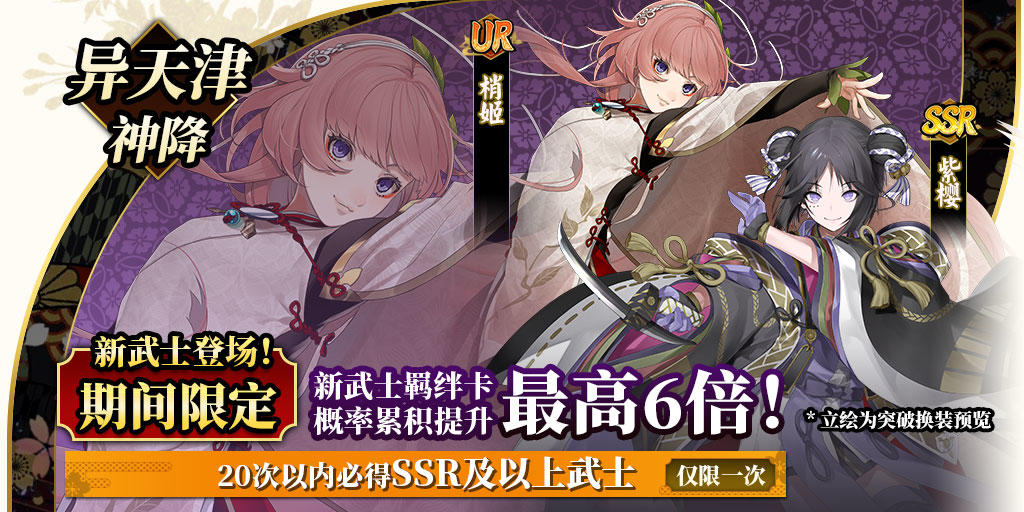 ※梢姬(UR/SSR)、紫樱(SSR/SR/R)在本次异天津神降结束后,会进入后续开放的祈愿神降卡池中。