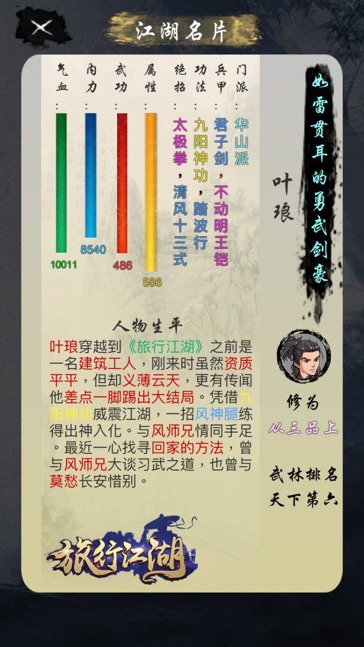 因为对武侠题材游戏尤为喜爱,到现在大大小小手机电脑主机网游玩了几百部了,玩旅行江湖的契机也是在武侠题材里不断刷找到的,其实一开始的时候看预览图,其实感觉画面一般,以为又是靠着金庸题材的套牌手游,正巧碰到测试,这一玩就根本停不下来,无论是战斗的方式还是奇遇都十分的让人着迷,也许是测试的关系吧,体力恢复和进度都十分的迅速,武功的成长,和剧情人物一步步的关系改善,一步步成长都是十分的有趣。