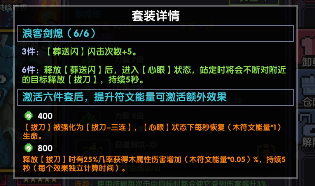 2、拔刀强化为拔刀三连,心眼状态下每秒回复(木符文能量*1)的生命。